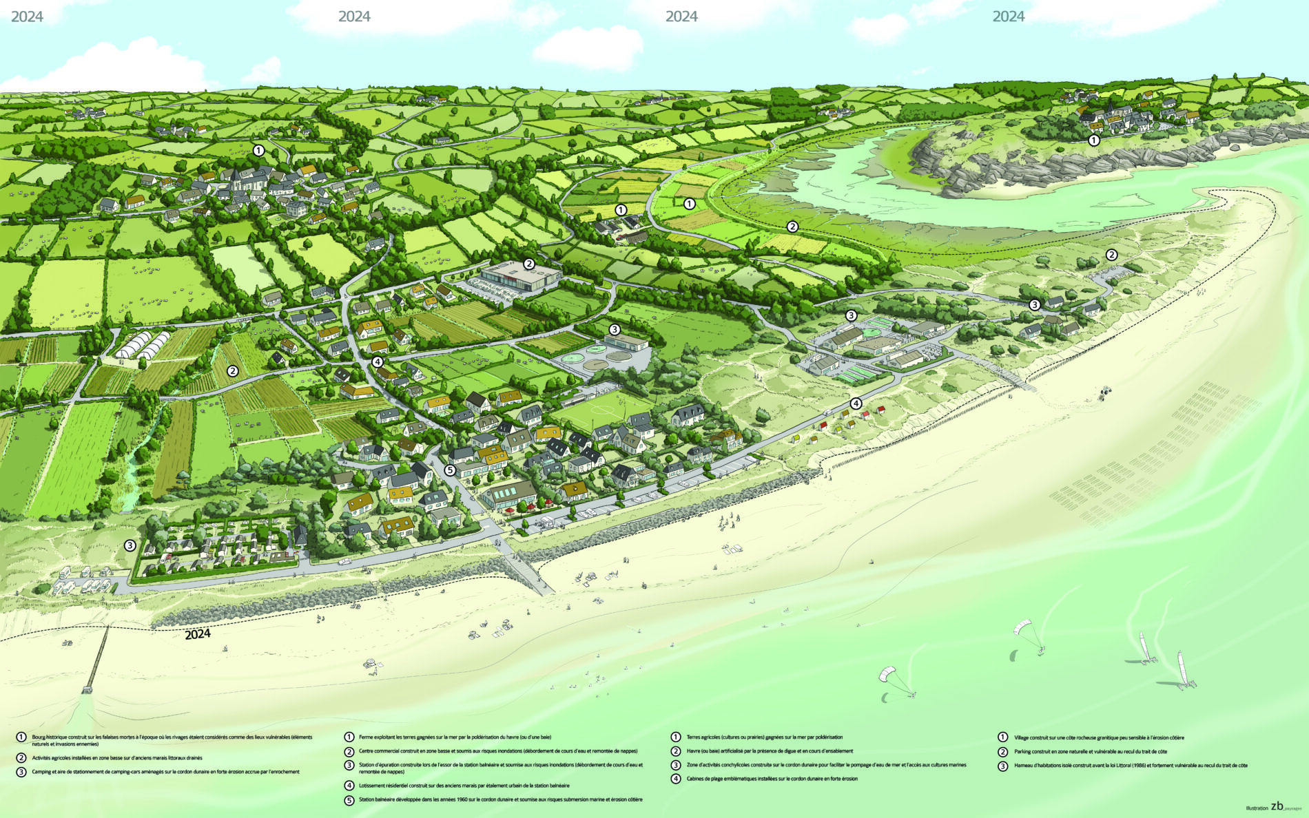 Dans un objectif résolument pédagogique, le travail graphique donne à voir l’évolution de ce paysage, l’implantation humaine sur le littoral, l’adaptation de l’architecture, des activités touristiques, agricoles et conchylicoles, et la renaturation progressives du rétro-littoral conjointement au recul du trait de côte.